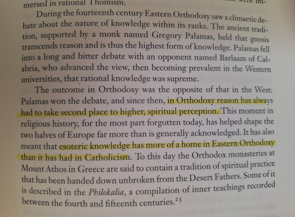 The outcome in Orthodoxy was the opposite of that in the West: Palamas won the debate, and since then, in Orthodoxy reason has always had to take second place to higher, spiritual perception. This moment in religious history, for the most part forgotten today, has helped shape the two halves of Europe far more than is general acknowledged. It has also meant that esoteric knowledge has more of a home in Eastern Orthodoxy than it has had in Catholicism.