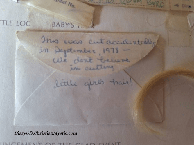The inauspicious event was commemorated in my baby book with a small lock of my white-blond baby hair and the caption: “This was cut accidentally in September, 1978—We don’t believe in cutting little girl’s hair!”